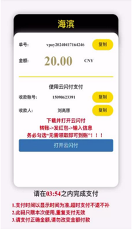 - the amount of payment and payee account details will be shown as below screenshot. User have to open the [YunShanFuAPP]to continue make payment.