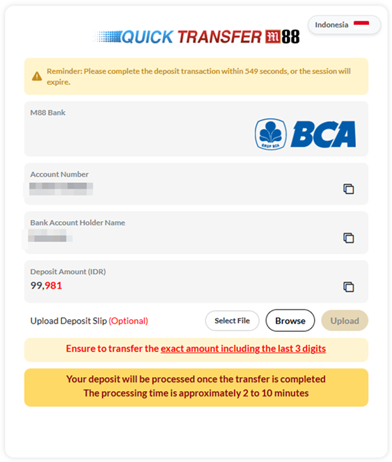 - Please transfer to the listed account, and make sure the amount you send matches the unique amount to ensure your deposit is processed smoothly.